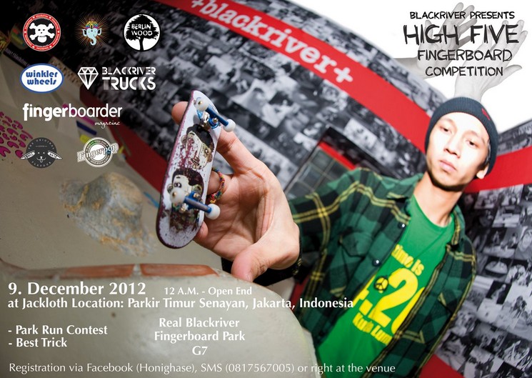 At least since this year’s Battle at the Barrics or the check out in the Fingerboarder Magazine we all know, that the Indonesian fingerboard scene doesn’t have to hide from the scenes in Germany or the USA. It’s a strong community with a large number of small brands and even an official Blackriver distribution called Honighase! With the support of Blackriver Honighase now organizes their first official contest in Jakarta! On Sunday, 9th December 2012 you are invited to shred your board from noon to open end. This event consist of a regular contest and a Best Trick contest. Both will take part on a G7 fingerboard park. Registration for the contest is on Facebook, via SMS or directly on site!
