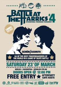 My friends, it´s 4. time of the very known contest: Battle of the Harrics! We made a point about this HERE Now we can see the official poster with all informations. So if I can sum that, it will be epic like every year. I saw an official facebook page and when I saw riders list, I´d like to come too. And another great thing is, here is many riders from exotic countries like Indonesia, so it´s another proof that, fingerboarding is going worldwide! Entry is free so if you´re not nominated, let´s go and see the show! Poster is bellow.