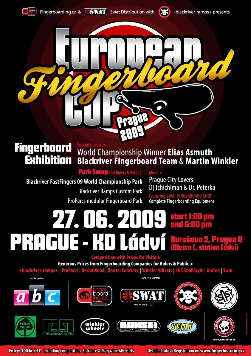 We would like to invite all riders to our contest and fingerboard meeting “European Fingerboard Cup 2009″. This happening is 27.6.2009 in Prague, organized by Fingerboarding.cz web, Swat Distribution and +blackriver-ramps+. Famous fingerboard personalities will appear, such as Elias Assmuth, Martin Winkler and more. If you are interested in promoting this happenig, we will be glad you let know your neighbourhood via these materials:Web Poster: here or hi quality for printing + banners here. Offcicial EFC Fingerboard Website is www.fingerboardcup.com