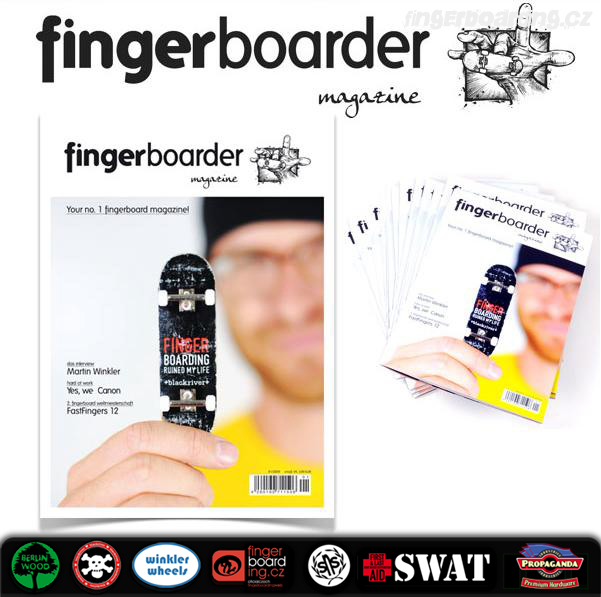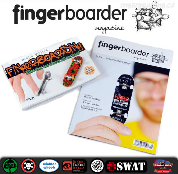 Po několika zmíňkách o připravovaném časopise Fingerboarder Magazine se nyní tento plátek dostává i k nám. Na swatu si nyní můžete vesele objednat tento časopis hned ve dvou vydáních a sice v anglickém nebo německém jazyce. Přečtete si třeba interwiev s hvězdou Martinem Winklerem, report z Fast Fingers 12, Ost Bowl Masters II a mnoho dalšího. Na swatu se také objevila kniha o fingerboardingu od Martina Winklera, kterou si můžete také objednat ve dvou jazycích. Kniha obsahuje vše co chcete vědět o fingerboardingu ale báli jste se zeptat. Buďte ale rychlí. Ke každému prodanému kusu této knihy získáte dle stavu skladu i jeden výtisk již zmíněného Fingerboarder Magazine.