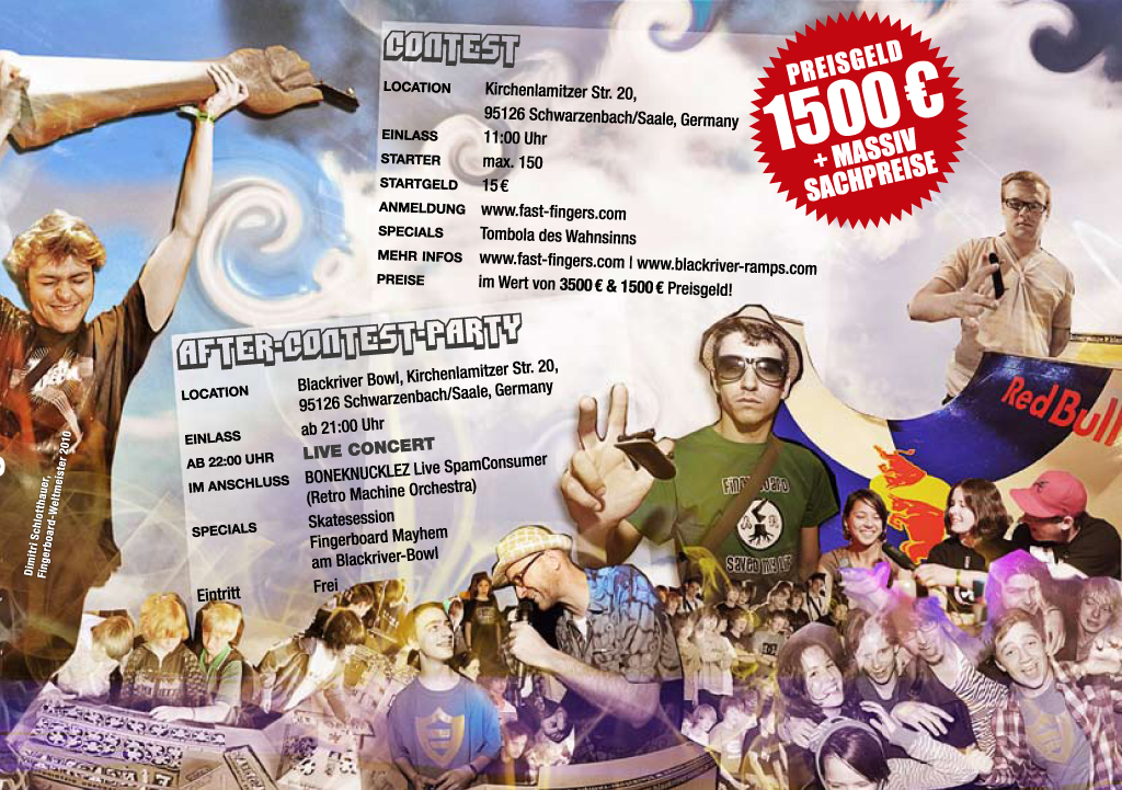 V německém Schwarzenbachu se tradičně pojede mistrovství světa Fast Fingers 14. Brány areálu se otevřou 28. května. K dispozici bude tradičně několik parků na volný pojezd a samozřejmě ten nový, dosud nezveřejněný, který se následně objeví také na EFC 2011. Půjde o hodně velkou akci a kdo můžete, určitě Schwarzenbach navštivte, protože to bude stát za to. Potkáte určitě mnoho známých jezdců z celého světa. Bližší informace najdete na oficiálním webu fast fingers.