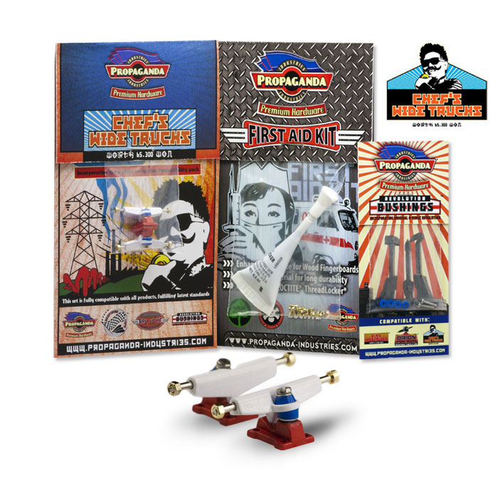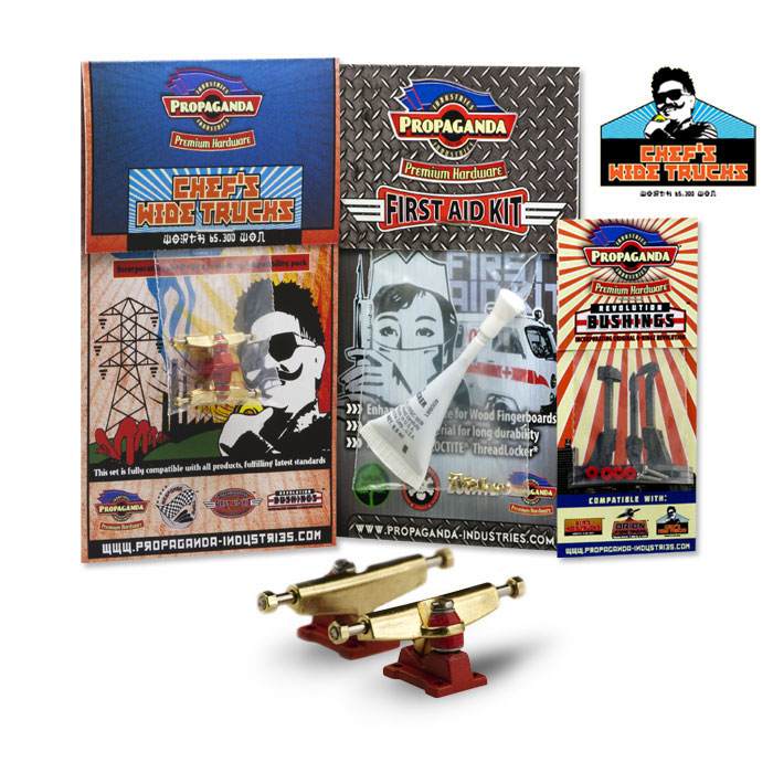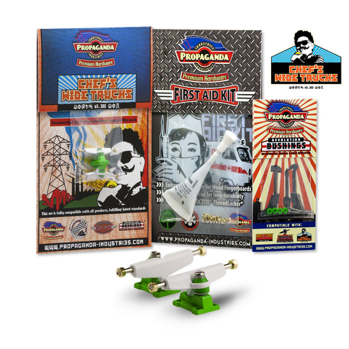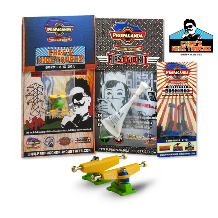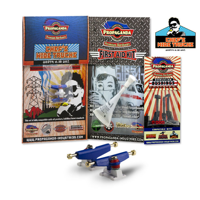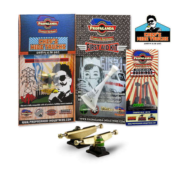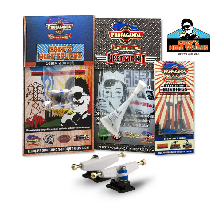 Propaganda Industries vydává profesionální variantu širokých trucků série Chef’s Wide Trucks, která bude k dostání v mnoha barvách a specialitkou bude volitelná tvrdost plně profesionálních bushingů Revolution. Série Chef má upravený sklon hangeru a trucky jsou osazeny novým kingpinem, v sadě dále najdete Propaganda First Aid LocTite Kit který využijetezejména pro fixaci matiček (LockThreader) a při výměnách kingpinu. Nehrozí žádné odpadávaní matiček a trucky budou mít konečně realistické chování i vzhled. Díky 3 volitelným tvrdostem bushingů si budete moci zvolit nejen barevnou kombinaci ale především takové jízdní vlastnosti, které vám nejlépe vyhovují. Tato série zasahuje do kategorie Hi-End. K dispozici budou měkké Soft, střední Medium a tvrdé Hard. Jako doplňek této série bude k dispozici také varianta „GrindRocker“ konstrukčně odlišná s masivnějším tělěm a speciálně určená pro grindování a dlouhou životnost. Dodávána bude v anodizované a perleťové metalíze či chromu. Obě varianty by měli být k dostání na EFC a později se jistě objeví i na swat shopu. Fotky trucků „Grindrocker“ zveřejníme jakmile je dostaneme do redakce, ostatní si můžete prohlédnout níže nebo si stáhnout ze stránky výrobce www.propaganda-industries.com