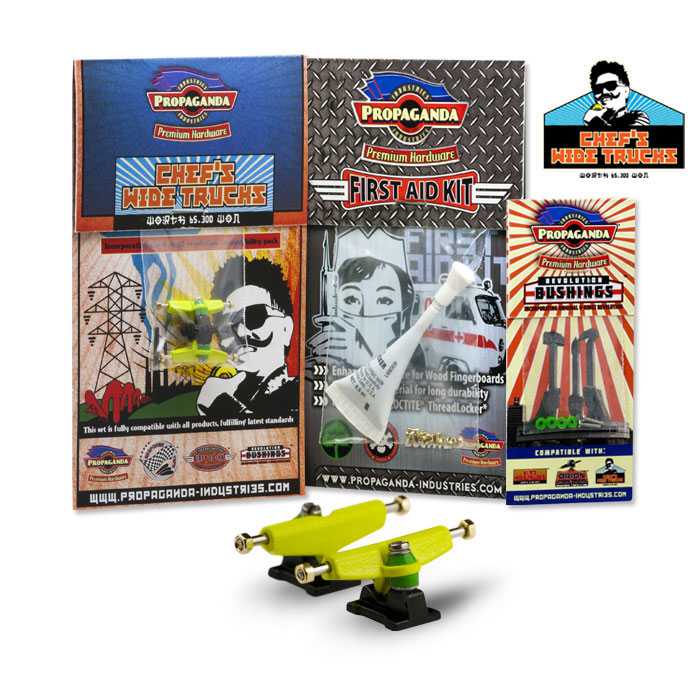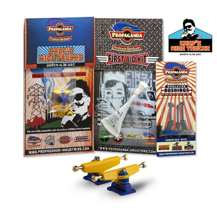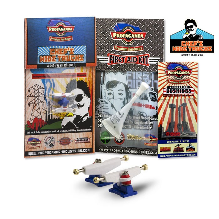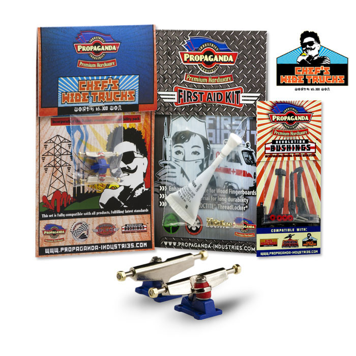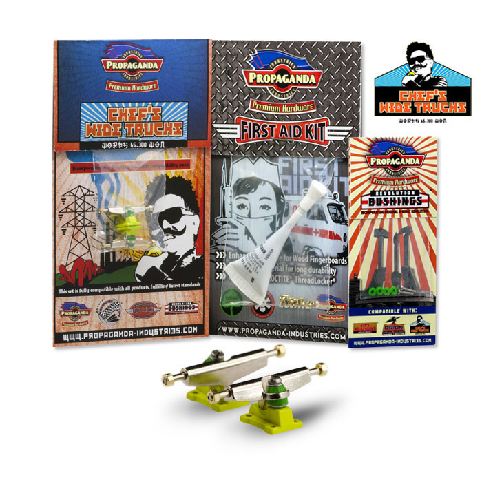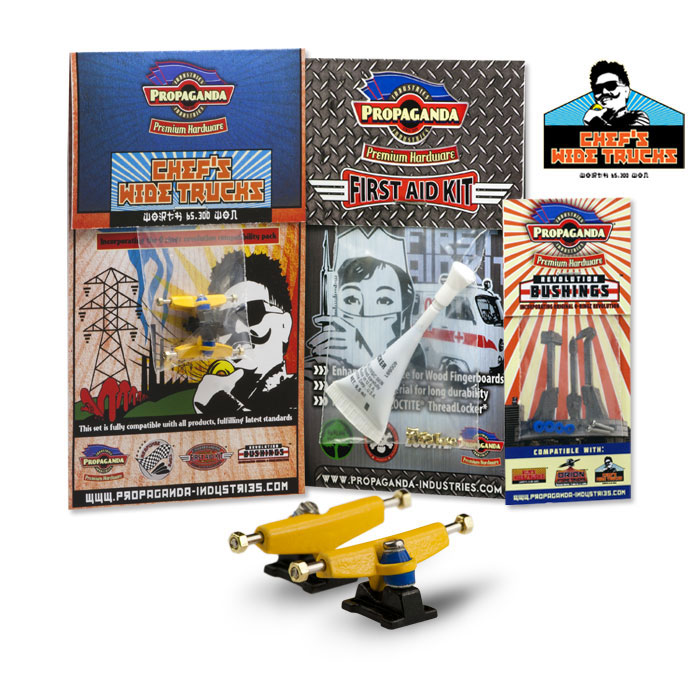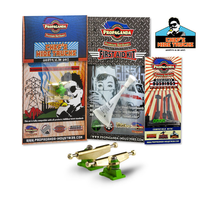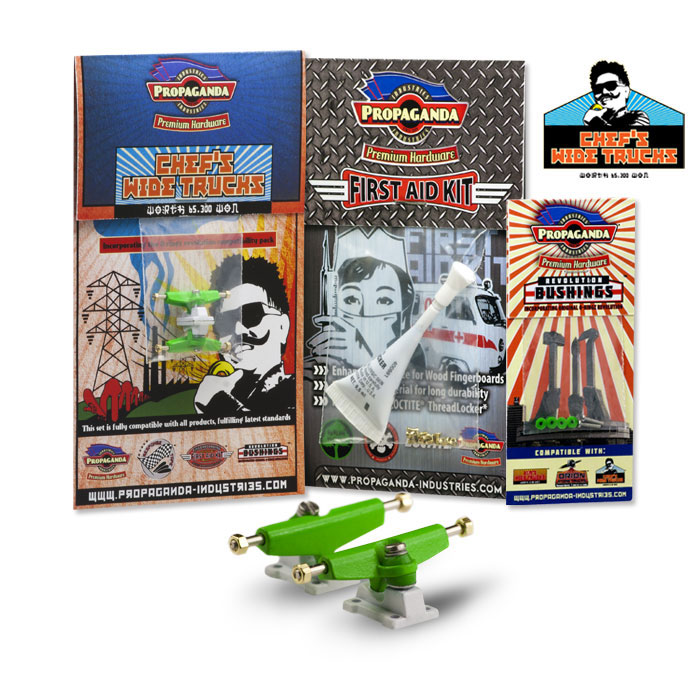 Propaganda Industries vydává profesionální variantu širokých trucků série Chef’s Wide Trucks, která bude k dostání v mnoha barvách a specialitkou bude volitelná tvrdost plně profesionálních bushingů Revolution. Série Chef má upravený sklon hangeru a trucky jsou osazeny novým kingpinem, v sadě dále najdete Propaganda First Aid LocTite Kit který využijetezejména pro fixaci matiček (LockThreader) a při výměnách kingpinu. Nehrozí žádné odpadávaní matiček a trucky budou mít konečně realistické chování i vzhled. Díky 3 volitelným tvrdostem bushingů si budete moci zvolit nejen barevnou kombinaci ale především takové jízdní vlastnosti, které vám nejlépe vyhovují. Tato série zasahuje do kategorie Hi-End. K dispozici budou měkké Soft, střední Medium a tvrdé Hard. Jako doplňek této série bude k dispozici také varianta „GrindRocker“ konstrukčně odlišná s masivnějším tělěm a speciálně určená pro grindování a dlouhou životnost. Dodávána bude v anodizované a perleťové metalíze či chromu. Obě varianty by měli být k dostání na EFC a později se jistě objeví i na swat shopu. Fotky trucků „Grindrocker“ zveřejníme jakmile je dostaneme do redakce, ostatní si můžete prohlédnout níže nebo si stáhnout ze stránky výrobce www.propaganda-industries.com
